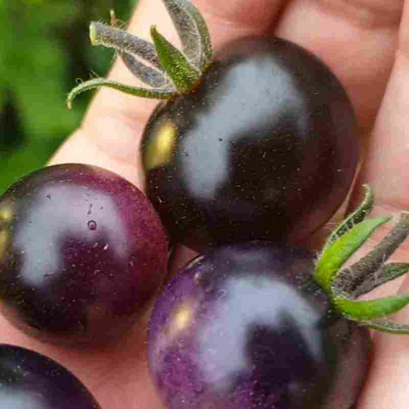 A colorful and tasty hybrid tomato with deep indigo to black coloring. The cherry tomato fruits form in nice clusters of 10-20, with a juicy, tangy flavor. This variety is a hybrid so you can expect consistent fruit quality. Indeterminate growth can produce large crops!