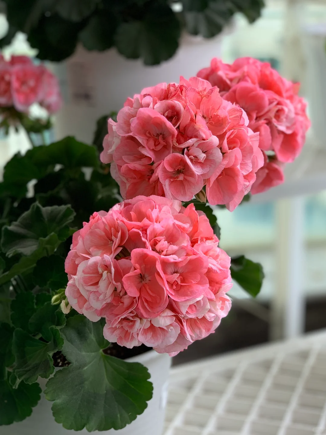 🌸Appearance: Apple Blossom Geraniums feature clusters of charming, rose-like flowers with delicate pink petals arranged in tight clusters. The flower buds resemble miniature rosebuds, adding to their appeal. The foliage is typically dark green and slightly glossy, providing an attractive backdrop to the blossoms.