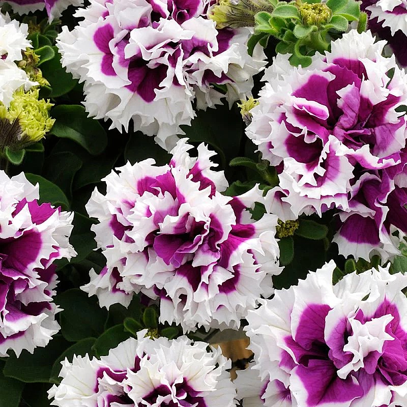 Fully double petunias with fringed flowers and beautiful white and purple picotee patterns, Pirouettes are known for their 3-4" (7.5-10cm) flowers. They are excellent annuals suitable for most locations and continue to be a popular choice for bedding plants, containers and hanging baskets. Their compact, upright habit makes these great bi-colored flowers stand out even more.