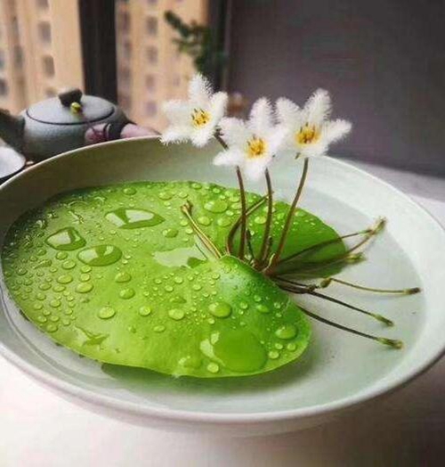 Its plant body resembles the leaves of a water lily, or a giant duckweed, round and green, with a slit reaching the center of the leaf, but it is smaller and more delicate than the water lily: the whole plant has only one leaf. Floating in a bowl of clean water, white flowers bloom in the center of the leaves. If you show interest, the florist will enthusiastically introduce to you that this plant is called "one-leaf lotus". It has only one leaf and only needs to be placed in clear water to bloom.